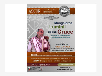 Joi, 21 aprilie, de la ora 19.30, în Amfiteatrul Facultății de Chimie din Cluj, părintele diacon Ioan Caraza va susține conferința cu tema „Mângâierea Luminii de sub Cruce în lucrarea lui Dumnezeu prin Mântuitorul Hristos”.