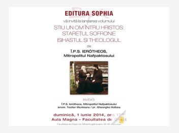 Editura Sophia organizează duminică, 1 iunie, de la ora 17.30, în Aula Magna a Facultății de Drept din București, lansarea volumului Știu un om întru Hristos: Starețul Sofronie, isihastul și theologul al Înaltpreasfințitului Ierotheos Vlachos.