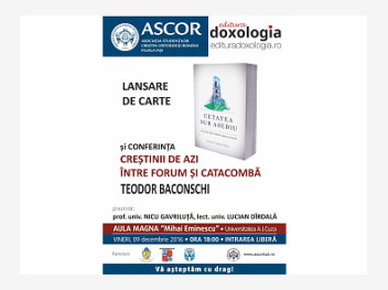 Vineri, 9 decembrie a.c., de la ora 18.00, în Aula Magna „Mihai Eminescu” a Universității „Alexandru Ioan Cuza” din Iași, Editura Doxologia, în parteneriat cu Asociația Studenților Creștin Ortodocși, filiala Iași, va lansa cartea „Cetatea sub asediu. Însemnări despre credință, rațiune și terorism” de Teodor Baconschi, în prezența autorului, care va susține și o conferință pe tema „Creștinii de azi, între forum și catacombă”.